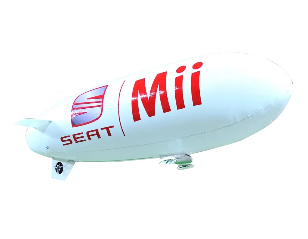 Desde Publi-Zeppelines proporcionamos un zeppelín cautivo de 6 m (modelo ZPU-6) fabricado en poliuretano blanco con decoración vinilo a doble cara con el logotipo de SEAT y la marca del modelo Mii.